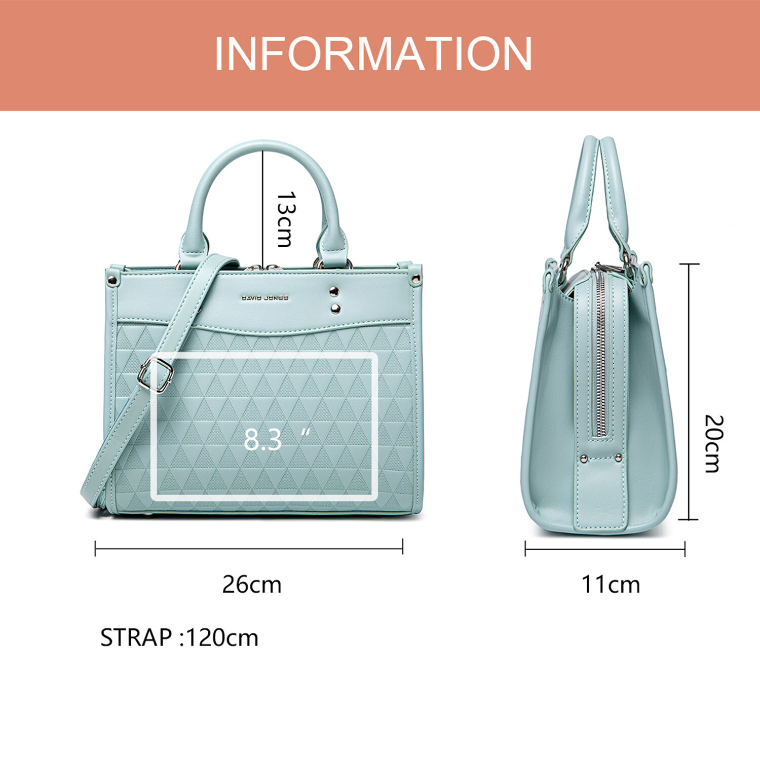 • DAVIDJONES , a brand comes from Paris since 1987.We are committed to provide our customer trendy and stylish women bags.Over the years, we have been selling to more than 100 countries at prices that make keeping up with seasonal styles a luxury within reach.DAVID JONES is the lifestyle brand for people who are Positive, Authentic, and Bursting with personality.We thank you for your great support.